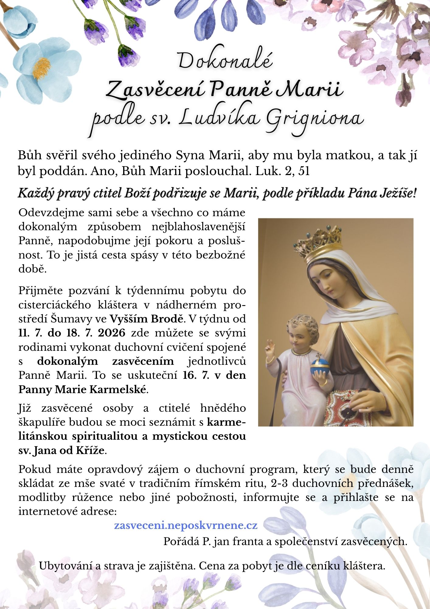 Letošní ročník 2026, pokud Pán popřeje, bude nově uspořádán. Účastníci se budou moci připravit na Dokonalé zasvěcení Panně Marii podle návodu sv. Ludvíka Maria Grigniona z Montfortu, jiná skupina, která už je Panně Marii zasvěcena, se bude moci něco dozvědět o karmelitánské spiritualitě zejména o mystické cestě sv. Jana od Kříže, kde se zaměříme na jeho knihu: Výstup na horu Karmel. V podstatě jde o to, jak se disponovat na sjednocení s Bohem.